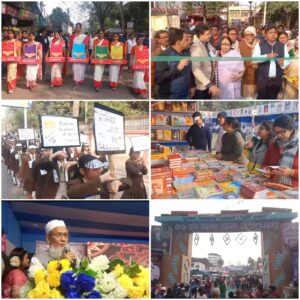 মালদা, নিজস্ব সংবাদদাতা :- ফিতে কেটে, মশাল জ্বালিয়ে ও নীল সাদা বেলুন উড়িয়ে এবং প্রদীপ প্রজ্জ্বলনের মধ্য দিয়ে পশ্চিমবঙ্গ সরকারের জনশিক্ষা প্রসার ও গ্রন্থাগার পরিষেবা অধিকার এবং মালদা জেলা স্থানীয় গ্রন্থাগার কৃত্যকের উদ্যোগে মালদা জেলা বইমেলা ও প্রদর্শনীর উদ্বোধন করা হলো মালদা কলেজ মাঠে। উদ্বোধনের আগে মালদা বৃন্দাবনী মাঠ থেকে বিশাল বর্ণাঢ্য শোভাযাত্রা বের হয়, শোভাযাত্রায় স্কুল কলেজ সহ বিভিন্ন শিক্ষা প্রতিষ্ঠান ও সংস্থা অংশগ্রহণ করে। সেই শোভাযাত্রা সারা শহর পরিক্রমা করার পর মালদা কলেজ মাঠে বইমেলার প্রবেশদ্বার ফিতে কেটে উদ্বোধন করা হয়। তারপর বইমেলা প্রাঙ্গণে মশাল জ্বালিয়ে বেলুন উড়িয়ে মেলার শুভারম্ভ করা হয়। মেলার উদ্বোধন করেন বিশিষ্ট কবি ও সাহিত্যিক বিনায়ক বন্দ্যোপাধ্যায়, সঙ্গে ছিলেন গ্রন্থাগার মন্ত্রী সিদ্দিকুল্লা চৌধুরী, সাবিনা ইয়াসমিন, তাজমুল হোসেন, জেলাশাসক নীতিন সিংহানিয়া, দুই বঙ্গরত্ন রাধাগোবিন্দ ঘোষ ও ডাক্টার দেবাশীষ সরকার, ইংরেজবাজার পৌরসভার পৌর প্রধান কৃষ্ণেন্দু নারায়ণ চৌধুরী সহ বিশিষ্ট অতিথিবর্গ। ২০ জানুয়ারির পর্যন্ত চলবে বইমেলা। প্রায় ২০০ টি বিভিন্ন প্রকাশনীর স্টল থাকবে এই বইমেলায়। এছাড়া বিভিন্ন ধরনের সাংস্কৃতিক মঞ্চে থাকবে বেশ কয়েকটি।