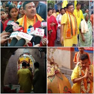 পূর্ব মেদিনীপুর, নিজস্ব সংবাদদাতাঃ- আজ ১লা বৈশাখ, আজকের দিনে পূর্ব মেদিনীপুর জেলার তমলুকের বর্গভীমা মন্দিরে পুজো দিতে আসেন স্থানীয় মানুষজনসহ দূর দূরান্ত থেকে আগত বহু ভক্ত, এই দিন বর্গভীমা মন্দিরে পুজো দিতে এলেন রাজ্যের বিরোধী দলনেতা তথা তমলুকের বিধায়ক শুভেন্দু অধিকারী, এই দিন ভক্তদের সঙ্গে পদযাত্রায় হেঁটে মন্দিরে পূজো দিলেন রাজ্যের বিরোধী দলনেতা শুভেন্দু অধিকারী,মন্দিরে পূজো দিয়ে সংবাদ মাধ্যমের মুখোমুখি হয়ে তিনি জানিয়েছেন এখানকার বহু উন্নয়নমূলক কাজ করেছেন তিনি, পাশাপাশি সাম্প্রদায়িক হিংসা নিয়ে একাধিক মন্তব্য করলেন তিনি, তিনি আরো জানিয়েছেন মা বর্গভীমা তার সাথে রয়েছেন তিনি সাধারণ মানুষের কাজ করে যাবেন।