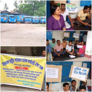 বালুরঘাট, দক্ষিণ দিনাজপুর, নিজস্ব সংবাদদাতা :- উত্তরবঙ্গ রাষ্ট্রীয় পরিবহণ সংস্থার বালুরঘাট ডিপো তে শ্রমিক ঐক্য মঞ্চের বিক্ষোভ অবস্থান। কন্ট্রাকচুয়াল কন্ডাক্টার, মেকানিক ও এজেন্সি নিযুক্ত কর্মীদের ১০৬৬ মেমোর আওতায় আনার দাবি তে এদিনের বিক্ষোভ অবস্থান ডিপো ইনচার্জের ঘরের সামনে। উত্তরবঙ্গ রাষ্ট্রীয় পরিবহনের বালুরঘাট ডিপোর সমস্ত রাজনৈতিক দল একত্রিত হয়ে শ্রমিক ঐক্য মঞ্চের ব্যানারে বিক্ষোভ দেখান। শ্রমিকদের দাবি সমহারে বেতন দিতে হবে।