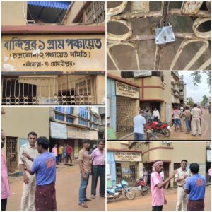 পশ্চিম মেদিনীপুর, নিজস্ব সংবাদদাতা:- বেহাল রাস্তায় চলাচলের অযোগ্য,গ্রাম পঞ্চায়েতে তালা ঝুলিয়ে বিক্ষোভ গ্রামবাসীদের, বুধবার ঘটনাটি ঘটেছে পশ্চিম মেদিনীপুর জেলার চন্দ্রাকোনা ২ নম্বর ব্লকের, বান্দিপুর ১ নং গ্রাম পঞ্চায়েতের খাগড়াপাড়া গ্রামে। স্থানিয় সূত্রে জানা যায় ওই গ্রামে প্রায় একশ ঘর বসতি রয়েছে,গ্রামে ঢোকার জন্য মোরাম রাস্তা দীর্ঘদিন ধরে বেহাল অবস্থায় পড়ে রয়েছে । রাস্তা মেরামতের দাবিতে গ্রাম পঞ্চায়েত কার্যালয়ে তালা ঝুলিয়ে রীতিমতো বিক্ষোভ দেখাই এলাকার মানুষজন। ঘটনার খবর যায় চন্দ্রকোনা থানায় , ঘটনার খবর পেয়ে দ্রুত ঘটনাস্থলে এসে উপস্থিত চন্দ্রকোনা থানার পুলিশ। বেশ কিছুক্ষণ ধরে চলছে বিক্ষোভ।