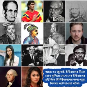 আজ ২ জুলাই। এক নজরে দেখে নিই ইতিহাসের এই দিনে ঘটে যাওয়া উল্লেখযোগ্য ঘটনা, বিশিষ্টজনদের জন্ম-মৃত্যু দিনসহ গুরুত্বপূর্ণ আরও কিছু বিষয়।