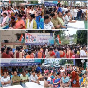 বালুরঘাট, দক্ষিণ দিনাজপুর, নিজস্ব সংবাদদাতা :- নানুর দিবস পালনের পাশাপাশি বিজেপি শাসিত রাজ্যে কর্মরত বাংলাভাষীদের ওপর ঘৃণ্য অত্যাচার ও চক্রান্তের বিরুদ্ধে প্রতিবাদ সভা দক্ষিণ দিনাজপুরের বালুরঘাটে। এদিন বালুরঘাট থানার সামনে বালুরঘাট শহর তৃণমূল কমিটির পক্ষ থেকে এই প্রতিবাদ সভা করা হয়। এদিনের এই পথসভায় উপস্থিত ছিলেন বালুরঘাট শহর তৃণমূল সভাপতি প্রীতম রাম মন্ডল, তৃণমূলের দক্ষিণ দিনাজপুর জেলা সহ সভাপতি সুভাষ চাকী, বালুরঘাট পৌরসভার চেয়ারম্যান অশোক মিত্র সহ অন্যান্য তৃণমূল নেতৃত্ব।
