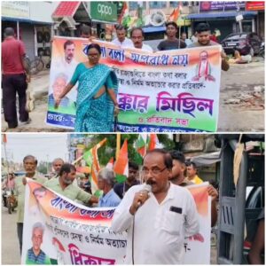 নিজস্ব সংবাদদাতা, মালদাঃ- — —বামনগোলা ব্লক কংগ্রেস ও যুব কংগ্রেসের উদ্যোগে ধিক্কার মিছিল ও প্রতিবাদ সভা পাকুয়াহাট এলাকায়। বাংলা বলা অপরাধ নয়, এই স্লোগানকে সামনে রেখে বৃহস্পতিবার বিকেলে বামনগোলা কংগ্রেসের পক্ষ থেকে একটি র্যালি করা হয়।যা গোটা পাকুয়াহাট এলাকা কংগ্রেসের কর্মীরা ঝান্ডা হাতে গোটা এলাকা পরিক্রমা করে রবীন্দ্র মোর এলাকায় বিক্ষোভ প্রদর্শন করতে থাকে তাদের অভিযোগ পশ্চিমবঙ্গের বাঙ্গালীদের বিজেপি শাসিত রাজ্যে গুলিতে বাংলা কথা বলার পরিচয় শ্রমিকদের হেনস্থা ও নির্মমভাবে অত্যাচার প্রতিবাদ জানিয়ে নেতা কংগ্রেসের কর্মীরা বক্তব্য রাখতে গিয়ে বিজেপিকে এক হাত নিয়ে ধিক্কার ও প্রতিবাদ জানান। এদিন উপস্থিত ছিলেন বামনগোলা ব্লক কংগ্রেসের সভাপতি জয়ন্ত সরকার, হবিপুর বিধানসভার যুব কংগ্রেসের সভাপতি বিশ্বনাথ রায়, ও অন্যান্য নেতৃত্ব