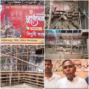 এদিন আমাদের ক্যামেরায় ধরা পড়লো চরম ব্যস্ততা মাঝে কাজ সারছে মন্ডপ শিল্পীরা , পাশাপাশি মন্ডপেই তৈরি হচ্ছে শ্রী শ্রী দুর্গা প্রতিমা। প্রতিবারের মত এবারও পঞ্চমী তে মুখ্যমন্ত্রীর দ্বারা উদ্বোধন হবে এই পুজো।তাই তার আগেই কাজ শেষ হয়ে যাবে বলে ক্লাব কর্তৃপক্ষ সূত্রে জানাগেছে। প্রাকৃতিক সামগ্রী বলতে যে সব ফল-ফলাদি পুজো বা মানুষের কাজে লাগে না, অথচ নষ্ট হয়। সেসব ফল দিয়ে তৈরি হচ্ছে এবারের হিলি বিপ্লবীর পুজোমন্ডপ।মৃশিল্পী বহিরাগত হলেও ভূমিপুত্র হিলির।থ্যাইল্যান্ডের বুদ্ধ মন্দির – এক কথায় বলা যায় এবছর একপ্রকার ব্যাপক সারা ফেলতে চলেছে হিলির বিপ্লবী সংঘের শ্রী শ্রী দুর্গা পূজা।যা দেখার জন্য সারাবছর অপেক্ষা করে থাকে জেলা তো বটেই জেলার বাইরে উত্তরবংগ ও দক্ষিন বংগ থেকে আসা প্রচুর দর্শনার্থী।