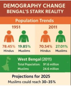 আদমশুমারির পরিসংখ্যান পরিবর্তনের বিষয়টি স্পষ্ট করে তুলেছে: ১৯৫১ সালে, হিন্দুরা জনসংখ্যার ৭৮.৪৫% ছিল, যেখানে মুসলিমরা ছিল ১৯.৮৫%। ২০১১ সালের মধ্যে, এই সংখ্যাগুলি হিন্দুদের ৭০.৫৪% এবং মুসলিমদের ২৭.০১% ছিল, যা ৯ কোটি ১০ লক্ষ জনসংখ্যার রাজ্যে ২৪.৬ মিলিয়নেরও বেশি মুসলিমকে প্রতিনিধিত্ব করে। ২০২৫ সালের জন্য অনুমানগুলি নির্দেশ করে যে উচ্চতর উর্বরতা হার এবং চলমান অবৈধ অভিবাসনের দ্বারা মুসলিমরা ৩০-৩৫% পর্যন্ত পৌঁছাতে পারে।