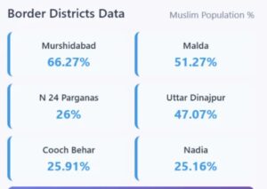 সীমান্তবর্তী জেলাগুলিতে এই বিবর্তন সবচেয়ে স্পষ্ট, যেখানে ভূদৃশ্য নৈকট্যের চাপের সাক্ষী। সমন্বিত বাঙালি ঐতিহ্যে পরিপূর্ণ মুর্শিদাবাদ জেলায় এখন ৬৬.২৭% মুসলিম বসবাস করে, এর গ্রামগুলিতে সীমান্ত জুড়ে প্রতিধ্বনিত উপভাষাগুলি প্রতিধ্বনিত হয়। মালদহে ৫১.২৭% মুসলিম বাস করে, যেখানে উত্তর ২৪ পরগনায় গড়ে ২৬% মুসলিম বাস করে কিন্তু ৬০% এরও বেশি এলাকা রয়েছে।