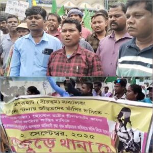 নিজস্ব সংবাদদাতা, মালদা:- পশ্চিমবঙ্গ জুড়ে আদিবাসী নাবালিকা ছাত্রীদের ওপর একের পর এক শীলতাহানি, ধর্ষণ ও হত্যার ঘটনায় অভিযুক্তদের দৃষ্টান্তমূলক শাস্তির দাবিতে সোমবার থানা ঘেরাও কর্মসূচি পালন করল আদিবাসী সেঙ্গেল অভিযান ও যেডিপি।সোমবার দুপুর প্রায় দু’টো নাগাদ সংগঠনের নেতা-নেত্রী ও কর্মীরা মিছিল করে এসে মালদা থানার গেটের সামনে বিক্ষোভে সামিল হন। তাঁদের অভিযোগ, বীরভূমে এক আদিবাসী নাবালিকাকে অপহরণ করে ধর্ষণ করা হয়, তারপর নির্মমভাবে খুন করে দেহ টুকরো টুকরো করে ফেলে দেওয়া হয়। এখনও পর্যন্ত ওই নাবালিকার দেহ সঠিকভাবে উদ্ধার করতে পারেনি পুলিশ। এই ঘটনাকে কেন্দ্র করে পুলিশের ভূমিকার তীব্র নিন্দা জানায় আন্দোলনকারীরা। সংগঠনের পক্ষ থেকে জানানো হয়, দোষীদের দ্রুত গ্রেপ্তার করে কঠোর শাস্তি দিতে হবে। যদি প্রশাসন কোনো ব্যবস্থা না নেয়, তবে দুর্গাপুজোর পরেই ‘বাংলা বন্ধের’ ডাক দেওয়া হবে।এদিন মালদা থানার আইসির হাতে একটি স্মারকলিপি জমা দেন আন্দোলনকারীরা। এই কর্মসূচিতে নেতৃত্ব দেন আদিবাসী সেঙ্গেল অভিযানের নেতা মোহন হাসদা সহ অন্যান্য নেতৃবৃন্দ।