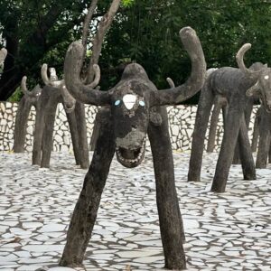 কোথাও পাথরের তৈরি মানবমূর্তি, কোথাও ভাঙা টাইলসের রঙিন মোজাইক, আবার কোথাও সারি সারি মাটির পুতুল যেন মিছিল করছে।