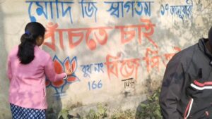 মোদীর সভা সফল করতে গাজোলে বিজেপির দেওয়াল লিখন কর্মসূচি, নেতৃত্বে প্রধান অর্মিলা রাজবংশী।