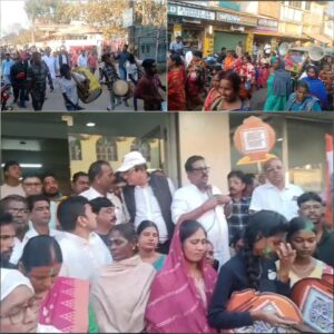 বীরভূম-রাজনগর, নিজস্ব সংবাদদাতা:- লক্ষ্মীর ভান্ডার প্রকল্পে ৫০০ টাকা বৃদ্ধি করায় রাজ্যের মুখ্যমন্ত্রী মমতা বন্দ্যোপাধ্যায়কে ধন্যবাদ, কৃতজ্ঞতা ও অভিনন্দন জানিয়ে মিছিল বের করা হয় রাজনগরে৷ মহিলা তৃণমূল কংগ্রেসের পক্ষ থেকে এইরূপ আয়োজন বলে জানা গিয়েছে৷ হাজির ছিলেন সিউড়ি বিধানসভা কেন্দ্রের বিধায়ক বিকাশ রায়চৌধুরী, তৃণমূল কংগ্রেসের রাজনগর ব্লক সভাপতি সুকুমার সাধু সহ দলের একাধিক নেতা, নেত্রী, সদস্য, সমর্থকবৃন্দ প্রমুখ৷ আজ বিকেলে রাজনগর বেসিক স্কুল থেকে মিছিলটি বের হয়ে এলাকা পরিক্রমা করে৷ বর্ণাঢ্য মিছিলের শেষে রাজনগর লাইব্রেরির কাছে বক্তব্য রাখেন বিধায়ক বিকাশ রায়চৌধুরী, সুকুমার সাধু ও মহম্মদ শরিফ৷ বিধায়ক সহ অন্য বক্তারা রাজ্য সরকারের বিভিন্ন প্রকল্পের সুফল, লক্ষ্মীর ভান্ডার সহ বিভিন্ন প্রকল্পে টাকা বৃদ্ধির বিষয় তুলে ধরেন৷ সেই সাথে বিভিন্ন ইস্যুকে সামনে রেখে বিজেপির বিরুদ্ধে সোচ্চার হন তাঁরা৷