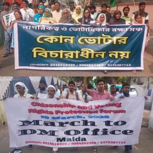 মালদা, নিজস্ব সংবাদদাতা:— কোন ভোটারকে বিচারাধীন রাখা চলবে না। খসড়া ভোটার লিস্ট অনুযায়ী সমস্ত মানুষকে ভোটাধিকার দিতে হবে-মঙ্গলবার এমনটাই দাবী তুলে মালদায় পথে নামলেন সাধারণ নাগরিকরা। নাগরিকত্ব ও ভোটাধিকার রক্ষা মঞ্চের ব্যানারে মিছিল করলেন মালদা শহরের বুকে। মিছিল শুরু হয় মালদা শহরের বৃন্দাবনী ময়দান থেকে। যা শহরের বিভিন্ন পথ ঘুরে জেলাশাসকের দপ্তরের উদ্দেশ্যে মার্চ করে। এদিনের এই মিছিলে নেতৃত্ব দেন নাগরিকত্ব ও ভোটাধিকার রক্ষা মঞ্চের সদস্য মাজিদুর রহমান। তিনি অভিযোগ করে বলেন, মালদার বহু মানুষকে ভোটাধিকার থেকে বঞ্চিত করার চক্রান্ত চলছে। যার অঙ্গ হিসেবে কোন কারণ না দর্শিয়ে বহু মানুষের নাম ভোটার তালিকা থেকে ডিলিট করা হয়েছে। এছাড়াও জেলার বহু মানুষকে বিচারাধীন তালিকায় রাখা হয়েছে। যা তারা মানতে নারাজ। তাদের দাবী একটাই খসড়া ভোটার তালিকা অনুযায়ী সমস্ত মানুষকে ভোটারধিকার দিতে হবে। এই দাবীতে আজ তারা মিছিল করলেন। মিছিলের পর ডেপুটেশন জমা করবেন জেলাশাসকের নিকট।