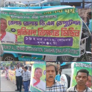 দক্ষিণ দিনাজপুর, নিজস্ব সংবাদদাতা:- গত সাতই মার্চ রাষ্ট্রপতি দ্রৌপদী মুর্মুকে কটুক্তি করা প্রতিবাদ আজ আদিবাসী ইউনাইটেড ফোরাম এর পক্ষ থেকে দক্ষিণ দিনাজপুর জেলা জেলাশাসকের দপ্তরের সামনে বিক্ষোভ ডেপুটেশন অনুষ্ঠিত হয় আদিবাসী ইউনাইটেড ফোরাম পক্ষ থেকে। তাদের দাবি অবিলম্বে রাষ্ট্রপতি দ্রৌপদী মুর্মুকে অপমান করার দোশিকে চিহ্নিত করে শাস্তি দেওয়া প্রতিবাদে আজ আদিবাসী ফোরাম এর এই ডেপুটেশন। যদি তাদের এই ডেপুটেশন এর মান্যতা না দেওয়া হয় পরবর্তীতে তারা গোটা জেলা জুড়ে বৃহত্তর আন্দোলনে শামিল হবেন।