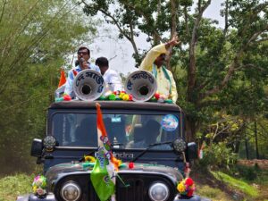 হুগলী, নিজস্ব সংবাদদাতা:- প্রথম দফার ভোটপর্ব আজ শেষ হলো। দ্বিতীয় দফার ভোটের আর এক সপ্তাহ ও বাকি নেই এর মধ্যেই হুগলীর গোঘাট বিধানসভার তৃণমূল কংগ্রেস প্রার্থী ডাঃ নির্মল মাজি আজ হুগলীর গোঘাট বিধানসভার কামারপুকুর অঞ্চলে বর্ণাঢ্য শোভাযাত্রার মাধ্যমে জনসংযোগ কর্মসূচি সারলেন। প্রচারের গাড়ি যত এগিয়েছে তৃণমূল প্রার্থীকে মানুষ ততই পুষ্পবৃষ্টির মাধ্যমে আর্শীবাদ জানিয়েছেন।প্রচারের মাঝে কুড়কুড়ে বাজনা ও বাজালেন তৃণমূল কংগ্রেসের প্রার্থী ডাঃ নির্মল মাজি। জয়ের ব্যাপারে তিনি আশাবাদি এমনটাও জানালেন সাংবাদিকদের।