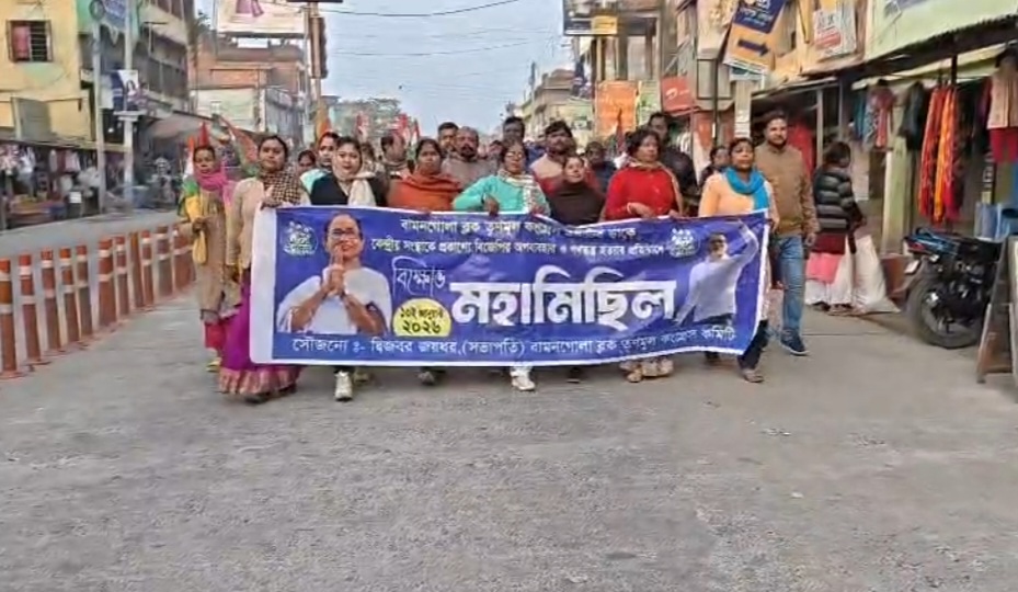আইপ্যাক অফিসে ইডি হানার প্রতিবাদে বামনগোলায় তৃণমূলের বিক্ষোভ ও ধিক্কার মিছিল।